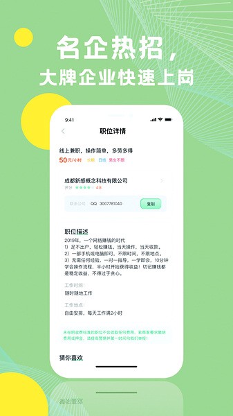2、优质推送,当求职者以及各大公司在线发布其信息时,平台会进行审核,确保信息的真实性。