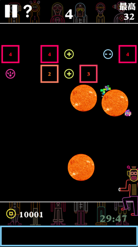 游戏内提供了四种道具,加号可以让下一回合的小球数加1,双向箭头可以让整行或整列的砖块数字减一,三向箭头可以分散小球,让小球从不同方向反弹出去,金币则是摇球需要。其中,三向箭头道具要多多利用,它可以让小球四散分开,形成“大乱斗”局面,一次性消除多个砖块,眼花缭乱,摆好姿势射出来,看着非常爽。加号的小球也要尽量击中,增加下一回合的小球。