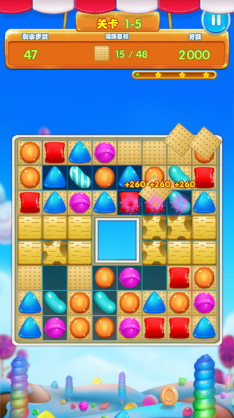 只需要双击糖果,就能将与点击的糖果连接着的同色糖果一并消除