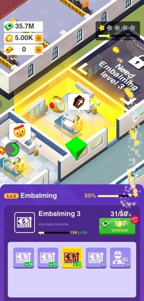 1、尽情的赚取更多的资金吧,只有这样我们才能慢慢的升级殡仪馆。
