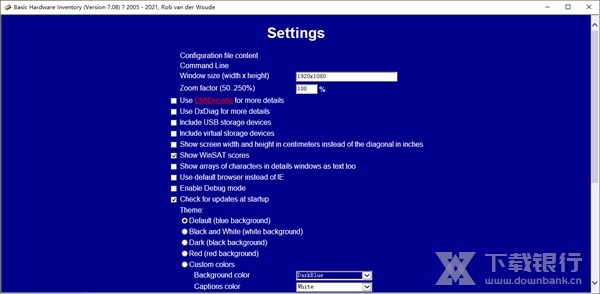 在这里,您可以设置首选的窗口大小,是否要使用DxDiag和/或DMIDecode(如果有)以获取更多详细信息,并且可以使用HTA的主题和自定义颜色设置。