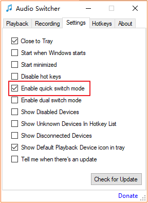 通过系统托盘图标切换设备同时,Audio Switcher还支持左键单击循环切换播放设备的功能,不过此功能需要在设置中开启,勾选Enable quick switch mode即可。
