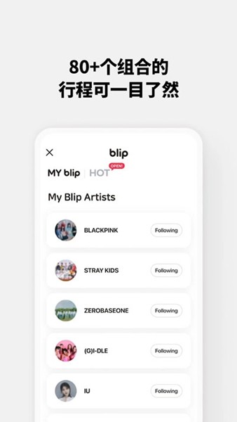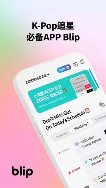 blip软件最新版是一款专门为追星族打造的韩流明星粉丝浮动交流社区,用户可以在软件中查看idol行程日常与相关影视、音乐作品,走在追星第一线。blip软件最新版拥有超过80多个韩流组合正式的日常行程表单,用户可以通过行程单,为自己的idol准备专属礼物,线下"偶遇"。此外,软件会不定期邀请明星在线直播,发糖发福利,是一个非常宠粉的粉丝交流社区。