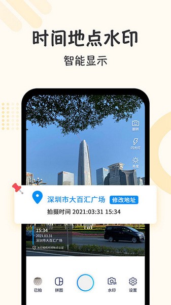 【水印相机】选好水印、一键拍照,水印照片自动生成;水印相机样式丰富多彩,让你的照片更时尚,朋友圈更出彩;爱美爱自拍就用水印相机专业版!一键获取当前时间地点作为水印,帮助用户拍照打卡!