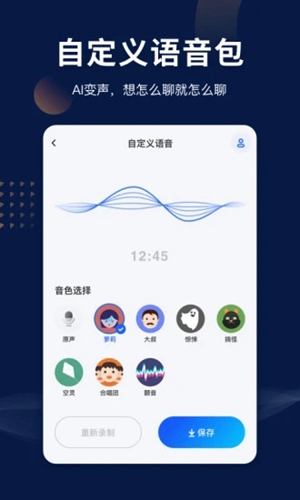 31种音色随心变,萝莉、志玲姐姐、熊大、蜡笔小新、海绵宝宝、小猪佩奇、安琪拉、粤语等多种风格任意转换,后续还会挖掘更多有趣的音色供小可爱们选择哦!录音完成后可以一键保存至自定义语音包,拥有你的个人专属声音库!