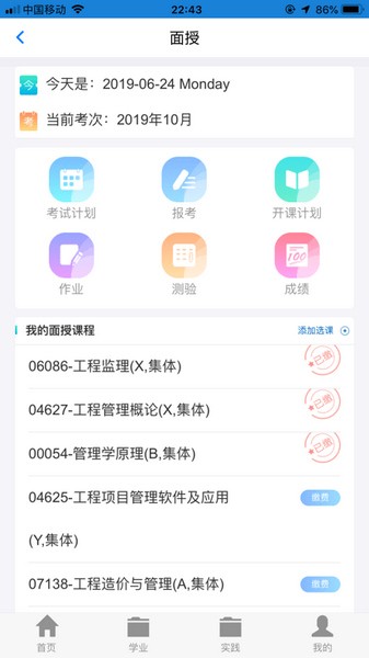 “课堂面授”是基于现有高等教育自学考试社会助学考生面授助学形式,主要功能包括:教学计划管理、报考管理、面授成绩、平时作业和综合测验、通知公告等功能,方便高校线下辅导,线上管理 。使用者只需要通过互联网界面,进行简单易用的操作,便可快速高效地以信息化手段记录老师教学情况以及考生学习情况、作业和测验情况等。