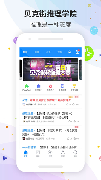 贝克街推理学院APP是一个推理爱好者们的聚集地,如果你也喜欢推理或者对各种案件谜题感兴趣,那么就赶快下载加入吧。这里除了有大量的用户之外,还有超多谜题等待用户们的解答,用户也可以在这里自己创作和分享各个精彩的谜题和推理作品。此外软件中还经常举办各种推理大赛,更有刺激的侦探排行榜系统。软件介绍