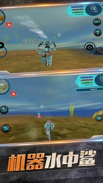 --在这里来成为一个超强大的鲨鱼机器人,你可以在海中和陆地上来展现出你强大的战斗技能。