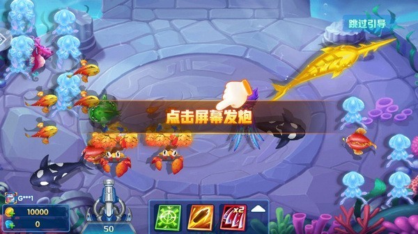 1、进入渔场后点击想要捕获的鱼,大炮就会发射捕捉网,连续点击有几率提升捕捉概率。