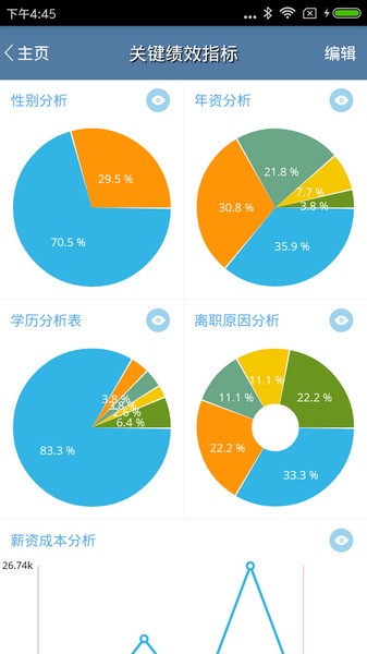 高阶主管可以查看关键绩效指标值,如:薪资成本分析,离职率分析,人力分布表,年资分析表,男女比例分析,加班率分析表。