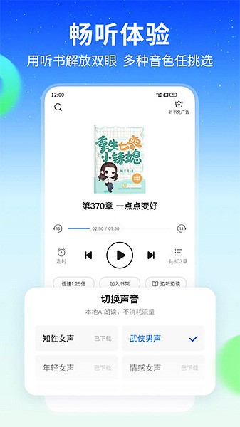 打开这个app,最让我惊喜的是它的听书功能。当你觉得看累了,就可以直接切换到听书模式,完全不耽误追剧情。更绝的是,它还有多种音色可以选择,我试了温柔女声和磁性男声,各有各的美妙,真的超级贴心!