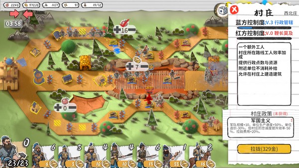 村庄:单位在村庄附近时会对村庄进行占领,占领速度由附近单位的影响力决定。村庄被占领后会持续提供粮食,同时与村庄同路的工人会获得20%的加速。远程单位在经过已占领的村庄时会停下进行驻守。
