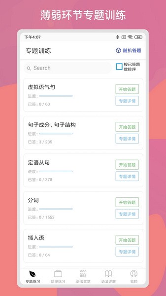软件里还有不少功能挺实用的,比如快速纠错、随机答题、题目收藏这些小细节设计得很贴心。最近我在用这个app复习语法,发现确实比自己随便做题更有针对性,尤其是遇到不会的题目还能看到详细解析,学得更扎实了。
