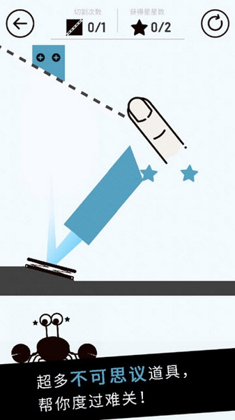 1、思考自己如何能切开下坠的方块的情况下还能把关卡里的星星收集齐,开动你的大脑,动用你的手看你是否能做到。