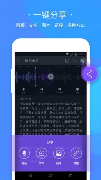 搜狗听写app是一款高效好用的语音转文字记录软件。这款软件能够帮助用户在诸如开会、采访等场景快速记录发言人说的话,能够精准地识别每一句语音,让用户记录更加得方便。同时,搜狗听写app还可与搜狗输入法进行联动,根据听取识别到的词汇来影响输入法的联想词,这样能够方便用户输入少见的专业性词汇。