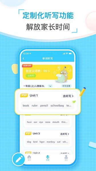 这个app有几个特别棒的功能:可以中英文搜索单词,支持很多教材版本;有母语国家的小朋友示范发音,孩子更容易模仿;还有发音分解功能,能清楚看到每个音的细节。最方便的是AI智能跟读评测,能检测发音准确性,而且有听写模式,家长不用总是盯着孩子学习了。