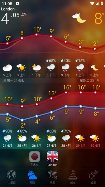 软件界面也很漂亮,像是看动画一样,地图上的昼夜交替特别明显。而且操作起来超级简单,随便点两下就能添加城市、查看日出日落时间,还能设置小部件和通知,方便得不得了!我个人觉得这个软件最大的亮点是它能提供那么多层天气数据,这对于喜欢研究天气的人来说简直是天堂。再加上它支持分享预测到社交媒体,随时随地都能和朋友炫耀一下自己的气象知识。
