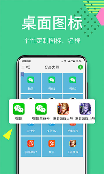 ●独立桌面图标:长按软件内分身APP图标,可进行添加桌面快捷方式,双开的应用在桌面就可使用,方便快捷;