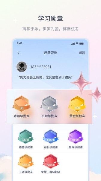 2、学习勋章,寓学于乐,步步为营,称霸法考,每次学习都可以得到更多进步;