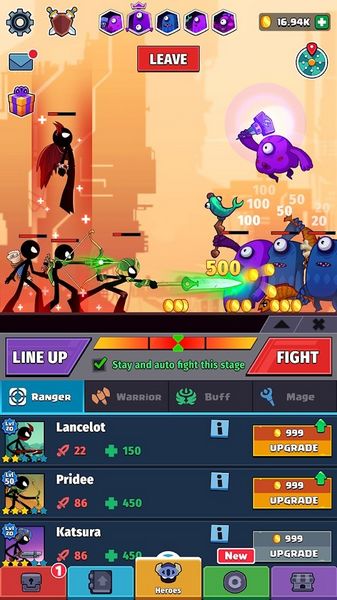 6、点击下方的英雄选项,还可以解锁已满碎片的火柴人,并且还可以在这里升级火柴人;
