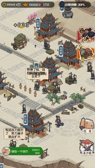 最后,少帮主可通过杀手榜来招募江湖侠客,通过入驻收购的建筑中来提升押镖的成功率,并且这样会为你提供更强大的战力