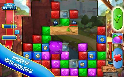 2、匹配两个或更多同色砖块来移除障碍,从邪恶的宠物大盗手中解救宠物。