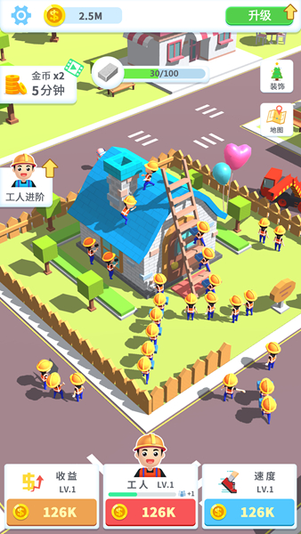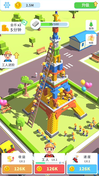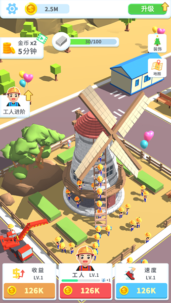 游戏中,玩家只需合理管理施工队搬砖赚钱。通过点触等操作即可放置砖瓦建材,按照任务提示完成关卡中的建造目标!点击屏幕,即可实现工人加速,升级工人,可以增加工人数量,如图: