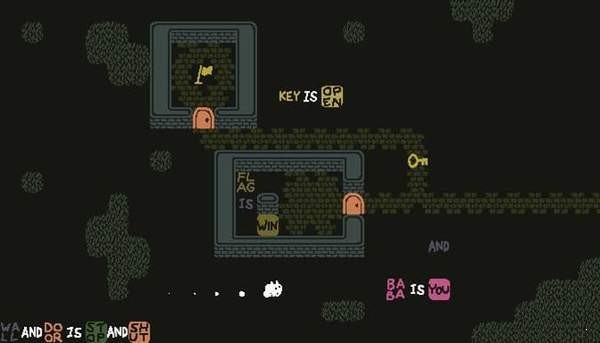 2、后来你能看到有关这个“规则”的各种变种,比如双层地图、用箱子填坑、单纯推出通路等等,场景中“baba is you”、“rock is push”、“flag is win”这些句子其实就是当前关卡的一个规则设定。