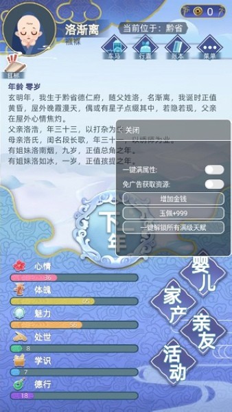 古代人生是一款非常好玩的竖版文字模拟养成类游戏,该游戏模拟体验古代百姓一生,在这里玩家将随机生成一个角色,每个角色都有心情、体魄、魅力、处世、学识、德行六种属性,玩家需要通过各种活动和选择来提升自己的属性,从而影响角色的命运和人生轨迹。在游戏中的选择大家都要谨慎进行考虑的,不同的选择影响的结局也都不一样,每一次的游玩都会让玩家体验到不一样的游戏乐趣,感兴趣的小伙伴快来下载体验吧!