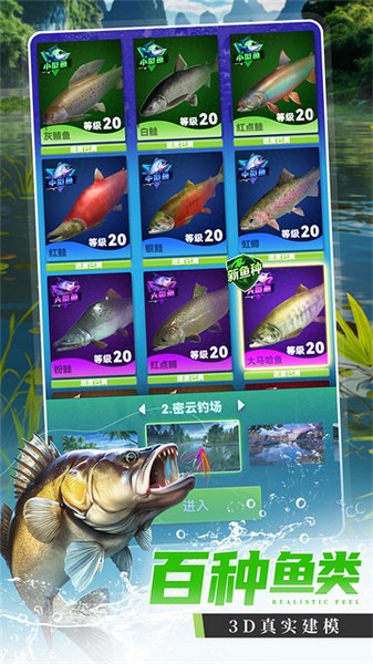 全新鱼潮,鱼种丰富,稀有鱼类应有尽有,蝠魟、豹蟾鱼、神仙鱼等上千种鱼类等你来探索,丰富鱼种让玩家将在游戏中锻炼自己的钓鱼技巧的同时还能增进鱼类知识,初学者和资深钓客皆宜。