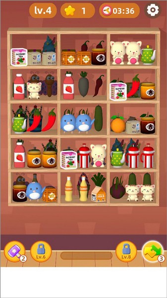 2、进入游戏,玩家需要找到相同的物品把他们放到一个货架上即可消除;