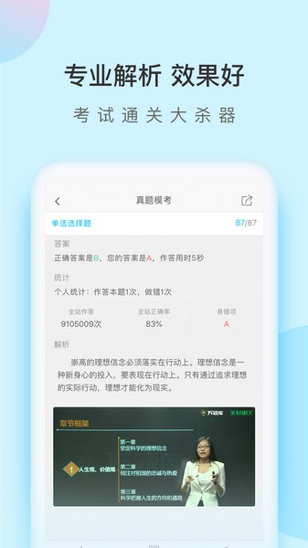 自考万题库为每一道试题录制了名师视频解析,对你没看错!就是试题的“视频解析」哦!看不懂答案和文字解析完全没关系,首都北京的「自考考试名师」讲到你懂!即使你是0基础,我们也不愿让你感受到一丝学习的痛苦与压力,力图让你做对每一道题,顺利通过考试简直不在话下!
