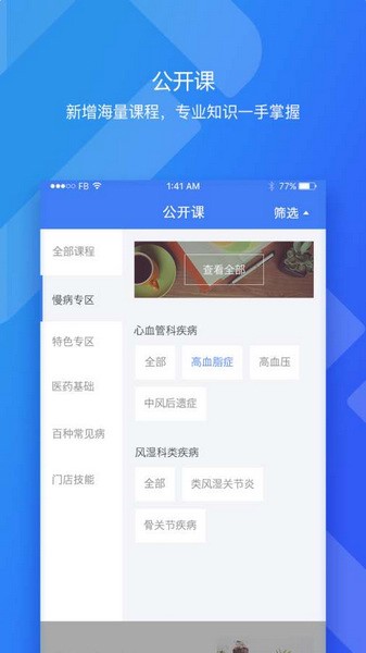1、专业学习:药店人可在心康助手上学习公司总部发布的课程并进行评测,同时还可自由学习专业的公开课程。助力药店人提高专业水平