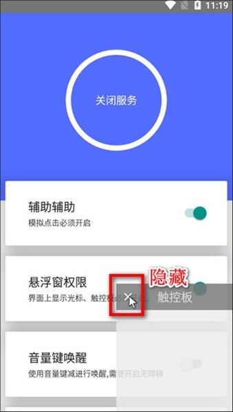 1、界面设计清新,一键点击开启服务,如果需要模拟,点击必须开启辅助功能,悬浮窗权限打开,界面上显示光标,触控板必须开启。