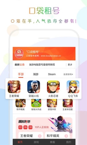 口袋租号APP是一款主打游戏账号租借的软件,界面简洁清爽,功能丰富强大,拥有海量游戏板块,种类繁多,囊括穿越火线、王者荣耀、QQ飞车、和平精英、绝地求生、LOL等,手机、电脑游戏全面触达,更有Steam账号等你来玩!且每个版块下都汇集了超多优质游戏账号,支持下单试玩15分钟,不满意即刻退款!此外,用户可以随时在个人中心管理各项内容,例如代付款、预约账号、维权等,让你借号更安心!