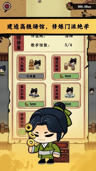 2、闲置经营,依靠简单的合成玩法来收取铜币,开办多家武馆连锁店,持续壮大你的武馆名声。
