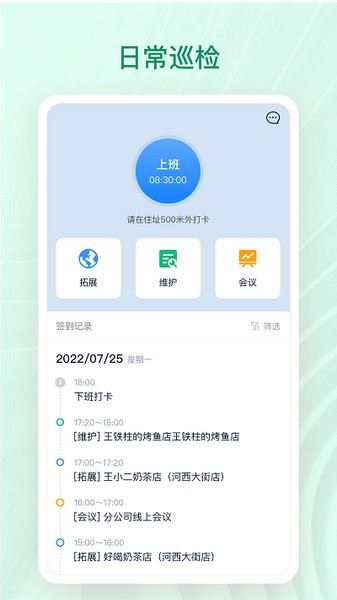 【日常巡检】围绕商户开展工作事项,支持日常拓展和维护商户等事项签到。