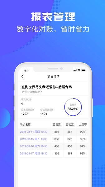 4、进入【报表管理】界面,每场的【场次】、【总售票数】、【总眼票数】以及【上座率】都实时刷新,一目了然,以上就是大麦麦控版app的使用方法了。