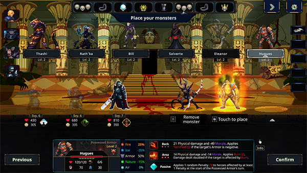 当勇者进入地牢后,会与玩家布置的怪物展开回合制战斗。玩家需要根据勇者的属性和行动,合理安排怪物的站位和技能释放,利用怪物的技能和陷阱来给予勇者致命一击。不同的怪物和陷阱有着不同的特性和能力,玩家需要根据探险者的弱点和策略选择合适的单位进行战斗。