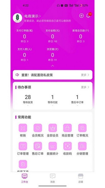 3.工作台上有多种功能,包括核销台,会员概况,全部会员,商品管理,订单概况,订单管理等等。