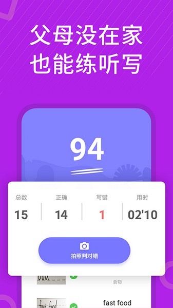 【听写测试】生词听写,孩子可自主选择年级课本进行重点单词测试,并且可以一键拍照判对错。