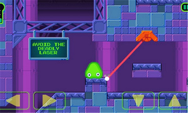 2、进入粘液实验室2游戏之后,我们就发现主人公小粘液了,绿色的身体两个大大的眼睛,跟个三角形小汽车似得,不要小看它,它会让你目瞪口呆的,接下来我们就开始我们的小粘液冒险之旅,大家可以看到界面上方有个提示,两个左右的箭头,下边写着to move,意思就是按方向键的左右来控制小粘液的行动,如图: