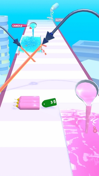 蜡烛礼物是一款非常简单的跑酷游戏,在这里我们只需要控制蜡烛左右移动就可以了,然后会自动前进并经过多道制作工序,从而生产出各种漂亮的蜡烛。根据自己的需求去选择是否要经过这些工序,不想要的话直接躲避过去就可以了,当然有些地方是必须要二选一的,那就没有办法了,最后能够组合出的蜡烛造型是非常多的。