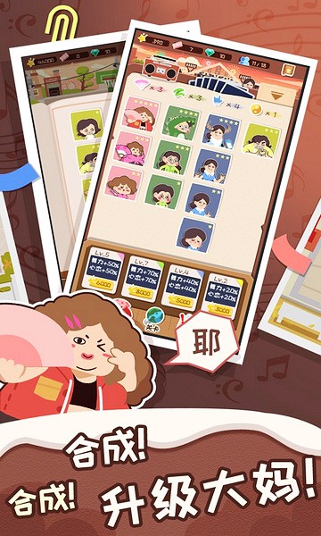 攒够人气之后就可以去购买大妈了,每次购买可以获得一个随机类型的一星大妈。将两个相同的大妈拖动合成就可以获得一个更高级的大妈,注意新获得大妈类型是随机的哦。