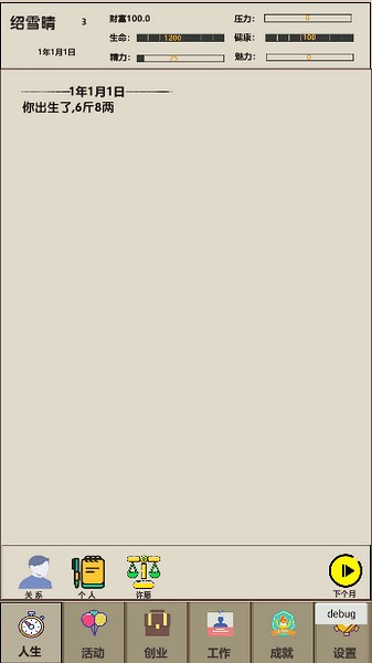 成长的主要属性有iq,eq,精力,学习能力,寿命,健康,压力等6个属性,iq和eq的作用主要用于生活,工作的提升,创业,学习能力是个人成长的关键属性,能力越强,进步的越快精力的设计源于时间,用于限制每个月的行为,精力可通过锻炼身体,旅游来提升,主要用于各种行为寿命的设计源于真实的人生寿命,每个人的理想寿命是100岁,有可能因为你的各种经历降低寿命,生病是游戏内主要影响寿命的因素。