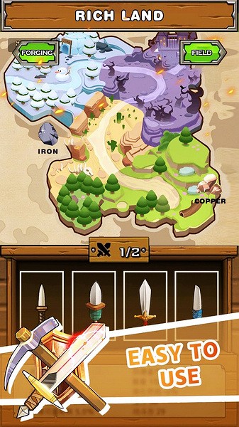 刀锋铁匠是一款非常好玩的放置养成类RPG手游,游戏中操作非常简单,大家只需要通过点击与放置就可以完成战斗,并且还支持离线战斗,游戏中大家通过不断的战斗来获得许多不同的材料,通过这些材料打造出更好的装备,以提升自己的实力,同时游戏中大家还能使用魔法赋予武器独特的战斗属性,战斗成功后大家还能获得非常丰富的金币奖励。