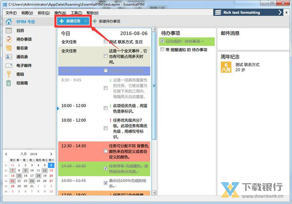 EssentialPIM还支持与很多在线服务同步,比如谷歌日历、iCloud等,这意味着你可以在不同设备上无缝管理信息。它的便携版本可以直接运行在USB闪存上,适合需要经常携带数据的人。此外,软件还内置了强大的任务管理功能,可以设置优先级和颜色标记,方便你更好地组织时间和任务。