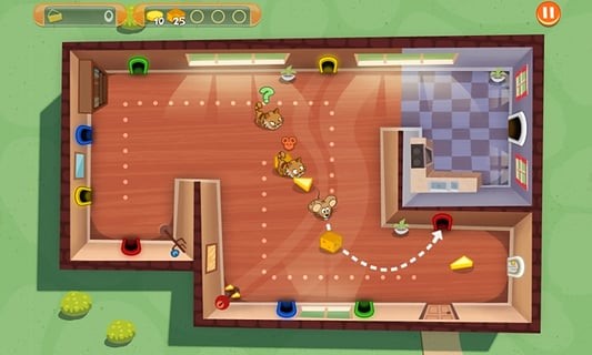 返回房间的间谍鼠移动速度增加,但时间有限。玩家需要把握好这个时机,跟在房间中间的黑猫身后,利用粉色房间的杯子作掩护,拿到最后一块奶酪。在利用最后一个杯子掩护,逃到大门外。