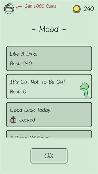 游戏里还有不少可爱的角色可以解锁,有些需要用游戏币兑换,这点可能有点小遗憾。切换心情的功能也很有意思,能给游戏增添更多趣味性。总的来说,Like A Dino 很适合用来放松心情,音乐和操作结合得很到位,玩起来既轻松又有挑战性。如果你喜欢简单又有趣的休闲游戏,这款应该不会让你失望!