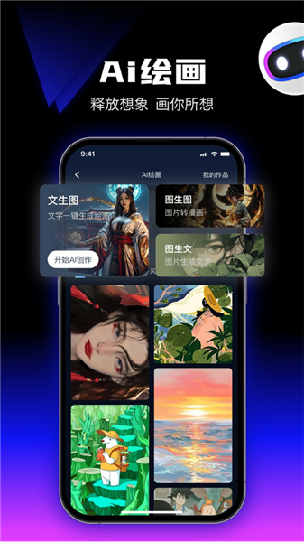 简单输入你的想法:“浪漫公主”、“白雪王子”、“海上日出”或者任何你能想像到的,选择你想要的任意风格,点击 “开始绘画” 等待作品生成,就能看到只属于你自己的专属作品,让你身临其境,妙笔生花。